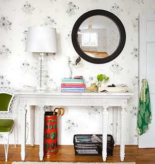 Hace poco me preguntaban "cómo dar una nota de color a un recibidor". El papel pintado es una opción, pero existen otras muchas formas de decorar la pared, desde pintar motivos o rayas, los vinilos que están tan de moda, un color liso y llamativo, espejos y/o cuadros... Y sí, como sugería Juanqui, también se puede pintar una franja de pizarra.